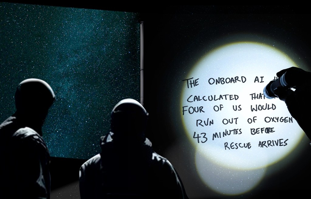 THE ONBOARD AI HAS CALCULATED THAT THE FOUR OF US WOULD RUN OUT OF OXYGEN 43 MINUTES BEFORE RESCUE ARRIVES